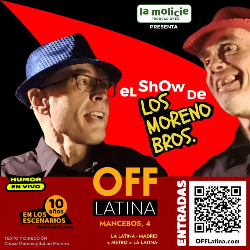 Los Moreno Bros seguimos en los escenarios, ya desde hace 10 años, ahora en OFF Latina Teatro. Allí estamos desde el 19 de septiembre pasado con unas funciones de "El Show De Los Moreno Bros" en las que ofrecemos 60 minutos de risas y entretenimiento. Hablamos de historias que no dejan a nadie indiferente y siempre con nuestro estilo característico irreverente sobre la vida. Nos dicen que estamos locos y a lo mejor es verdad, ya que nos ponemos a hablar y vete a saber las historias que contamos en cada función.